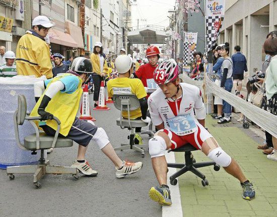 近日,第11屆日本辦公椅競速賽在日本岡山縣倉敷舉辦。今年有71支參賽隊(duì)伍,每支隊(duì)伍有3名成員,參與者要經(jīng)過30米的直線預(yù)選賽,最終決賽是180米環(huán)形賽道。